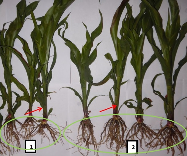 Фото 1. Влияние предпосевной обработки семян кукурузы препаратом BINoc КУКУРУЗА на развитие растений (1 - контроль, 2 - опыт. Растения опытного варианта имели более развитую корневую систему и больший диаметр стебла).