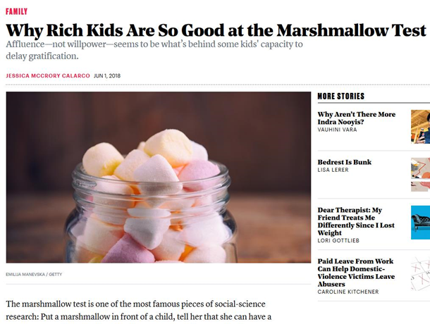 between early delay ability and later achievement. But we also found that these associations were highly sensitive to the inclusion of controls») Среди важных сторонних факторов отмечены не только доходы семьи, - на что сделала акцент социолог из Индианы, - но и уровень образования матери. Именно этот последний фактор оказался