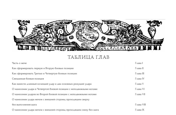 «Прочитав Книгу по Оружию, написанную господином Франческо, я получил огромное удовольствие. Я воспринял основную доктрину и также почувствовал именно эту тонкую грань оживлённости моего духа. Для меня большая честь получить все эти преимущества от изучения Искусства Оружия. Я свидетельствую о том, что V.S. подарил миру мудрость своего выдающегося ума. Это лишь самая маленькая хвала его достоинства, чести и Бессмертной Славы. Таким способом последующие поколения Рыцарей могут вступать в эту смертельную жизнь. Этот рассказ написан проклятым языком, который через века передал всю мудрость использования оружия. Этот чрезвычайный язык - язык сердца, в котором укоренились все причины и, таким образом, его Страх уходит. После этого я попал в лабиринт проклятия со злыми осуждениями и бесчестием, но в конечном итоге целую руки V.S. и каждый раз бесконечно благодарю Небеса.»