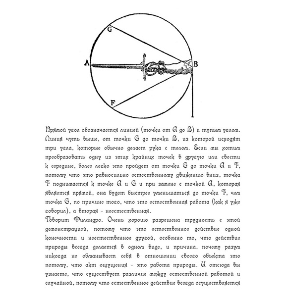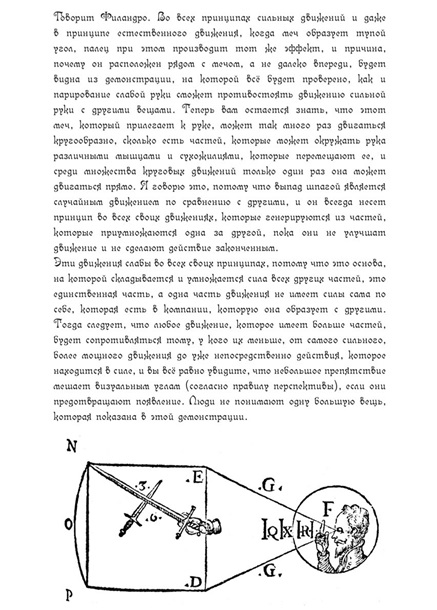 «В первом диалоге рассматриваются части истинной Дестрезы, а во втором глобально и в частности рассмотрена ложная, ненастоящая Детреза, но при том, что, обналичивая обманы вульгарных фехтовальщиков, доказывая это с помощью стойких демонстраций, кажется, есть вещи, которые не такие общие, как в первом диалоге, потому что многие их не понимают, но они настолько целесообразны для цели, которую преследует наука об оружии, что было бы невозможно знать фехтовальщику о том, что подходит для совершенствования мастерства».