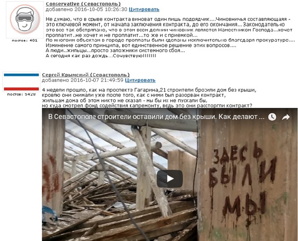 Примечательно, что данное заявление правительства Севастополя прозвучало почти сразу после заявления начальника управления ЖКХ и топливно-энергетического комплекса Севастополя Евгения Бортникова о том, что в городе вскрыты и брошены подрядчиками 5,5 тысяч квадратных метров кровель в многоквартирных . Если в скором времени найдут подрядчиков и выделят им необходимое количество средств, то починить крыши можно будет только в ноябре. В этом заявлении интересны 2 момента: во-первых, ситуация возникла потому, что город не заплатил подрядчикам, а это значит, что и следующие подрядчики рискуют остаться без денег, ну и во-вторых, история развивается осенью, в сезон дождей, что свидетельствует о демонстративно наплевательском отношении отцов города к его жителям.