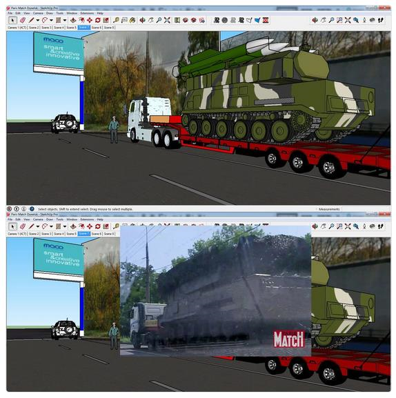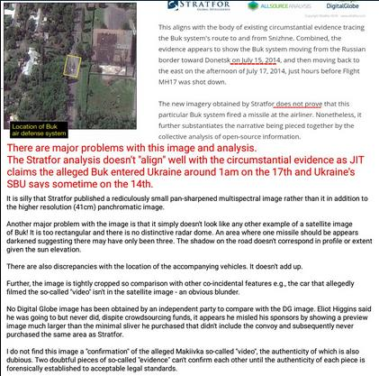 На этом дело не закончилось - после анализа давней статьи Stratfor, где было показано якобы спутниковое фото "того самого" Бука, оказалось, что данные Stratfor слегка отличаются от данных Элиота Хиггинса. Но самое неприятное - это то, что представленный снимок, видимо, очень неудачная работа в графическом редакторе...