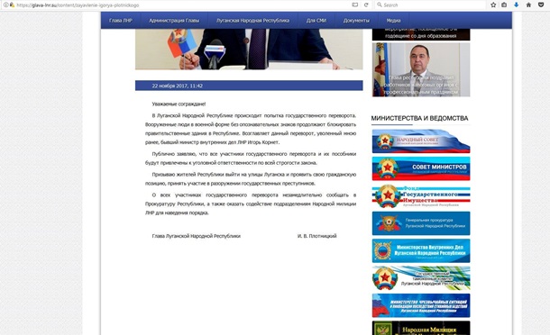 «Возглавляет данный переворот уволенный мною ранее бывший «министр внутренних дел» Игорь Корнет», – говорится в заявлении, опубликованном на сайте «главы государства».
