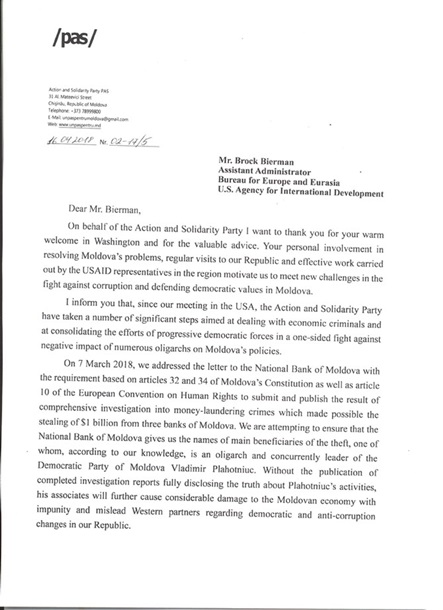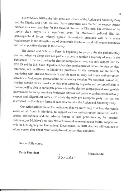 Пока Сильвия Раду, Ион Чебан, Андрей Нэстасе и прочие схлестнулись в борьбе за должность примара Кишинева, оставшиеся в стороне от столичных выборов политики не теряют времени зря. Например, Майя Санду, которая поддержала кандидатуру Андрея Нэстасе, решила сосредоточиться на подготовке к парламентским выборам и активно налаживает международные связи. В середине феврале 2018 года она встретилась в Вашингтоне с заместителем помощника госсекретаря США Бриджит Бринк и главой Бюро по делам Европы и Евразии Агентства США по международному развитию (USAID) Броком Бирманом. Эти встречи послужили дополнительной мотивацией для Санду активизировать антикоррупционную и политическую деятельность на различных фронтах. Например, лидер партии "Действие и солидарность" отправила письмо в с требованием огласить полные результаты расследования о краже миллиарда из банковской системы страны. Об увлеченности Санду борьбой с коррупцией можно судить также из письма политика, адресованного главе Бюро по делам Европы и Евразии USAID Броку Бирману.
