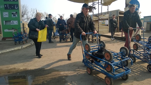 «перевозчики», которые на тележках возят грузы и товары «челноков» через линию