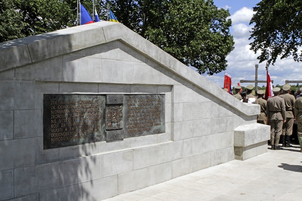 Комиссия во главе с гуманитарным вице-премьером Ураины Павлом Розенко в направленном в Прагу письме заявила, что Киев с самого начала планов реконструкции выступал против фразы «старой славянской земле». Однако в Чехии это отрицают и заявляют, что украинцы не были против фразы во время обсуждения проекта. По словам представителей чешского правительства, секретарь украинской комиссии Святослав Шеремета выразил возражение только перед торжественным открытием мемориала, которое состоялось 2 июля 2017 года (очевидно, впервые прочитав текст на таблице).