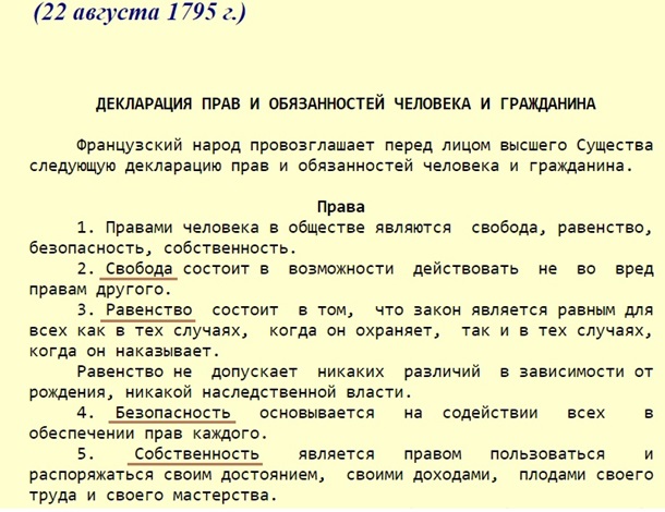 Вернёмся к Великой французской революции (1789-1799). Безраздельная власть монархов, повальная бедность большинства населения на фоне купающихся в роскоши аристократов, несправедливость законов вывели людей на улицы. Чего они требовали?