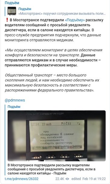 Диспетчеров российского предприятия "Мосгортранс" обязали вызывать правоохранителей, если им поступит сигнал о нахождении в общественном транспорте китайцев.