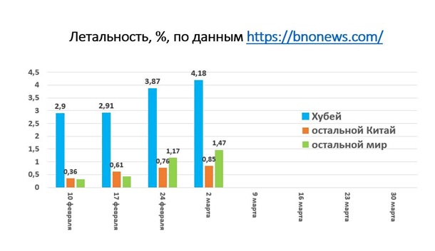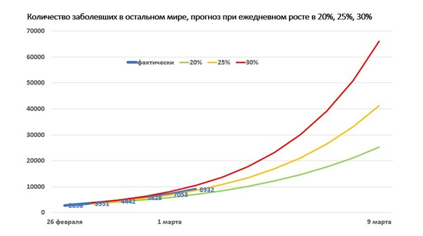 Завершилась 9 неделя. Как я и предполагал месяц назад, эпидемия в Китае к марту закончилась. Только теперь необходима правка: "первая волна пандемии в Китае закончилась". В мире инфицированные зафиксированы в 65 странах. Летальность в провинции Хубей превысила 4,0%, в остальном Китае приближается к 1%, в остальном мире колеблется около 1,5%. Темпы нарастания в остальном мире пока около 25% в сутки. Через неделю количество заболевших в остальном мире может достигнуть 40 тысяч.