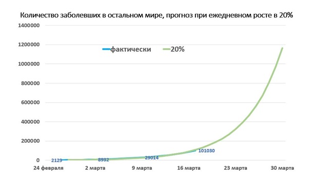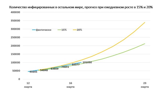 Хорошие новости - "остальной" мир уходит с 20%-й кривой ежедневного роста. Куда уходит? Пока на 15%-ю кривую. Которая в конце марта выводит на 650 тысяч инфицированных.