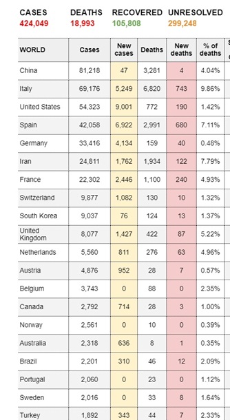 За прошедшие сутки мир легко преодолел 40 тысяч ежедневного прироста. Учитывая быстрый рост большого количества кластеров можно предполагать, что отметка "100 000" скоро будет пройдена