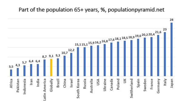 Что дальше? Как только заболеваемость начнет снижаться благодаря глобальному карантину и мир осознает, что это ПОКА ТОЛЬКО вторая волна, можно будет начинать говорить о долгосрочных стратегиях противостояния вирусу. Глобально пандемию легче перенесет Африка, Индия и Латинская Америка, где количество людей 65+ ниже среднемирового уровня 9,1%.