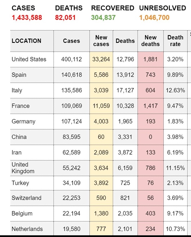 Что нужно, чтобы мир успокоился? Ощущение управляемости. Последние две недели марта официальное количество инфицированных увеличивалось на 11% ежедневно. В течение 7 апрельских суток - на 8%. За сутки добавилось рекордное количество смертей. Но миру уже не так страшно. Поэтому пора начинать говорить о модификации карантинных мероприятий.