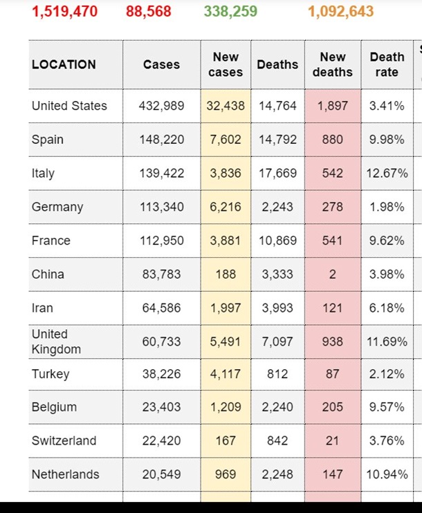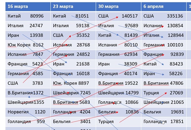 В мире нет единого сценария. Посмотрите на таблицу. В перечне стран-лидеров постоянно идут перемещения. Много факторов - плотность населения, количество и размер мегаполисов, процент пожилых в популяции, количество человек в семье, особенности карантинных мероприятий, развитие туризма в стране и т.д.