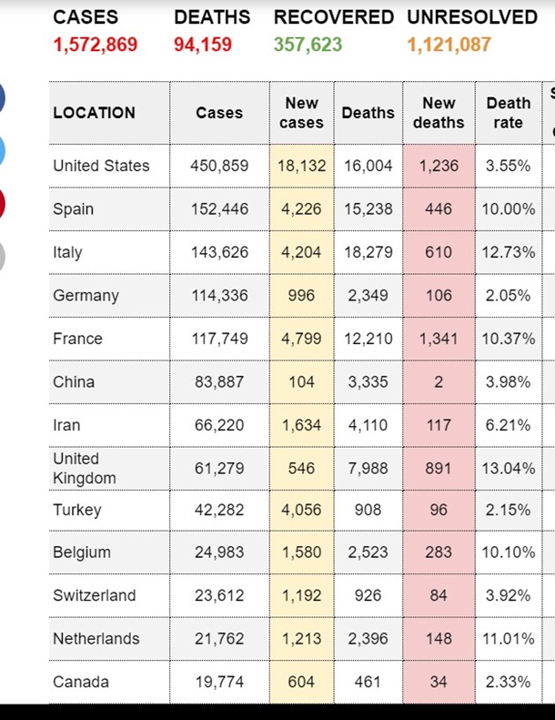 В странах-лидерах Германия и Великобритания набрали менее тысячи новых инфицированных, США, Испания, Италия, Франция, Иран -от 3 до 4%. Только Турция дала 10%-й рост.