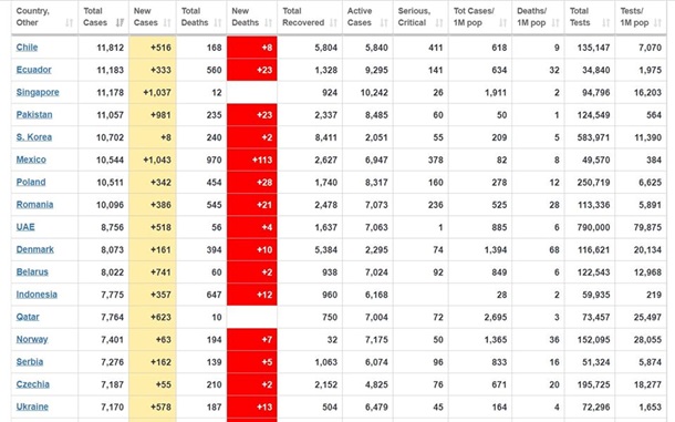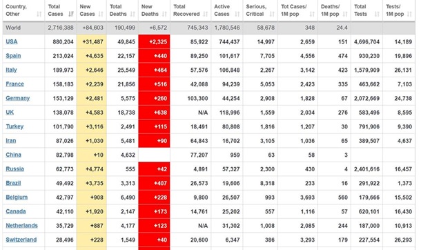 В мире ситуация прежняя. Общее количество инфицированных по официальным данным планомерно (80 000 в день) приближается к 3 миллионам. В России рост снизился к 8% в сутки. Среднемировая предварительная летальность достигла 7%. При этом, среди американских военных она остается на уровне 0,4%.