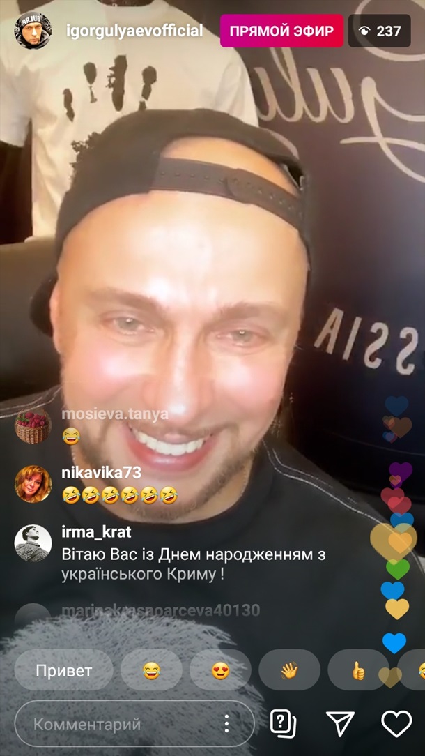 "Сьогодні вночі привітала в прямому ефірі із Днем народженням в Інстаграм відомого російського дизайнера Ігоря Гуляєва від усього українського Криму. Ігор зачитав в голос моє повідомлення, після чого посміхнувся, подякував, але не злякався, що я зробила акцент на тому, що Крим все ж українська територія.