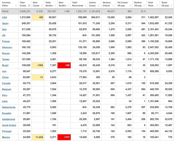 За сутки инфицированы очередные 80 тысяч человек, суммарно 2 млн 646 тысяч. Это те люди, анализ которых показал 1 или более раз наличие РНК вируса. А сколько инфицировано на самом деле? Неизвестно. Учитывая среднюю предварительную летальность 6,9%, можно предположить, что от 10 до 100 миллионов человек. Тогда зачем нам данные о 2,6 миллионах инфицированных? Да, собственно, незачем. Только в странах с летальностью ниже 1% эти цифры близки к реальным. Что это за страны? Ближний Восток (Бахрейн, Кувейт, Оман, ОАЭ, Саудовская Аравия),СНГ (Россия, Белоруссия, Узбекистан, Казахстан), Исландия, Гана, Сенегал, Джибути.Что их объединяет? Много тестируют. В Исландии протестировано 15% населения, в ОАЭ - 12%.