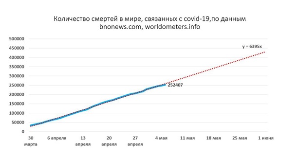 В течение апреля количество летальных исходов росло в линейной последовательности +6400 в сутки, в мае прирост замедлился и пока описывается уравнением +4800 в сутки. К 1 июня при таких темпах количество смертей вследствие коронавирусной инфекции дорастет до 380 тысяч. За 2020 год - до 1,4 миллиона. Эта цифра маловероятна, т.к. нарастание количества летальных исходов начало снижаться, но возьмем ее за ориентир. Много это или мало?