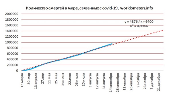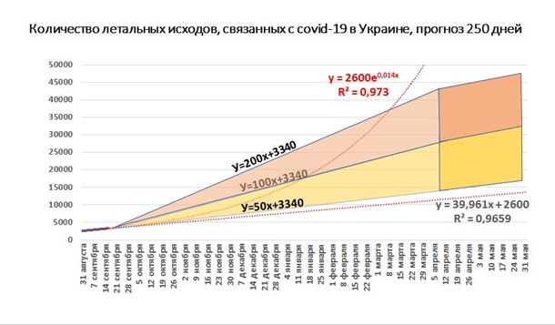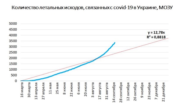 В Украине все менее радостно, т.к. ТОЛЬКО СЕЙЧАС, благодаря 6-месячному жесткому карантину начинает разворачиваться первая волна. Никакой линейной зависимости нет, идет эскпоненциальный рост, характерный для начала волны.Сентябрьские средние 40 летальных исходов в сутки, к сожалению, очень скоро трансформируются в 50-100, возможно 200 ежедневных смертей НА ПРОТЯЖЕНИИ холодного сезона. Это выведет нас на 10-15 тысяч смертей на 1-е января 2021 года и 20-40 тысяч летальных исходов по итогам холодного сезона.