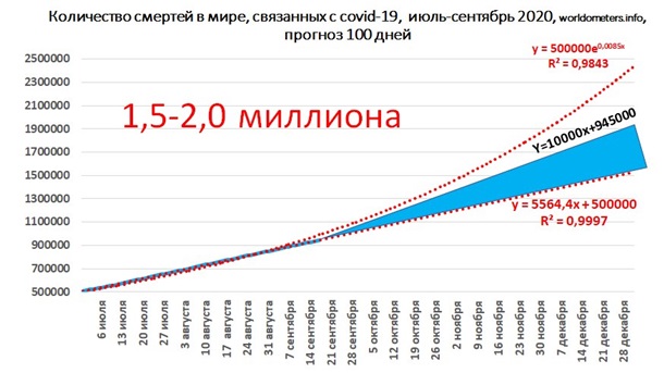 Какой критерий наиболее объективен? Количество летальных исходов. Хотя нахождение коронавируса не всегда означает, что причиной смерти стало covid-19, лучшего инструмента для статистической обработки пока не вижу. В мире погибло на сегодня 945 тысяч человек, в течение последних месяцев количество летальных исходов в сутки достоверно отображается линейной зависимостью - y=5500x+500 000 (суммарное количество смертей на 28 июня). С началом холодного сезона в Северном полушарии возможен отрыв от этой прямой, но на мой взгляд, в пределахх 10 000 смертей в сутки. Т.е. по итогам 2020 года мир получит 1,5-2 миллиона смертей, связанных с коронавирусом. Это 3% мировой летальности (58-59 миллионов). А это много или мало? Сопоставимо со смертностью от туберкулеза и СПИДа. И, не стоит забывать о том, что избыточная летальность, вызванная пандемией будет постепенно компенсироваться, т.к. в течение ближайших нескольких лет уменьшится количество смертей от разных причин. Упрощенно: меньше умрет от инфарктов и инсультов, т.к. их убил (убъет) коронавирус.