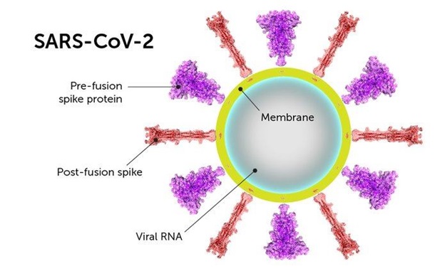 Вакцина Moderna, как и Pfizer / BioNTech (РНК-вакцины инкапсулированы в липосомы), она представляет собой вакцину с матричной РНК. SARSCoV2 покрыт белками Spike(это шипы), которыми он захватывает человеческие клетки(рецепторы АСЕ2). Вакцина состоит из небольшого генетического материала «РНК-мессенджер»(вставка), которая инструктирует человеческую клетку сделать часть белка Spike(шипа).(рис1)