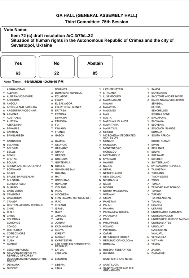 В среду, 18 ноября, Третий комитет Генассамблеи ООН по социальным и гуманитарным вопросам принял украинскую резолюцию, осуждающую нарушения прав человека в Крыму