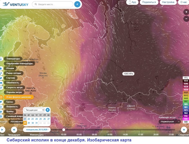 Казалось бы, вновь судьба встречать в Киеве новый год в осенних курточках и без рукавиц. Однако против окажется сибирский антициклон. Тот самый, который метеорологи именуют Азиатский максимум. Он же Сибирский студень, он же Монгольский антициклон. Это сезонное явление мощной и устойчивой области высокого давления над Сибирью, которое в условиях континентального климата формируется в середине зимы. От его поведения зависят многие температурные аномалии. Когда его отроги прорывались в Европу, звенели рождественско-крещенские морозы под минус 30. В этом году Сибирь передаёт привет Поднебесной: в ночь на 1 января столбики термометров в Пекине будут показывать около -20℃.