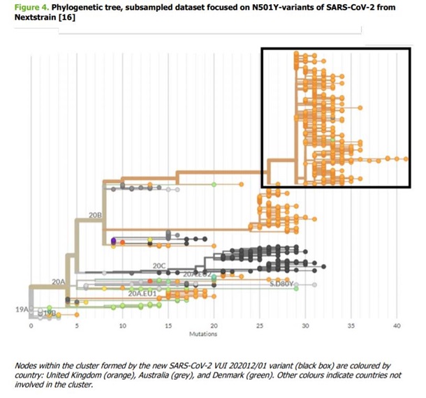 В этом штамме зафиксировано 9 отличий белка шипа (deletion 69-70, deletion 144, N501Y, A570D, D614G, P681H, T716I, S982A, D1118H). Мутация N501Y лоцируется в receptor binding domain. На 20.12 лишь в10-12% проб в Великобритании, доступных секвенированию, был выделен этот мутант (1-й рисунок).
