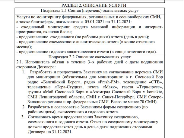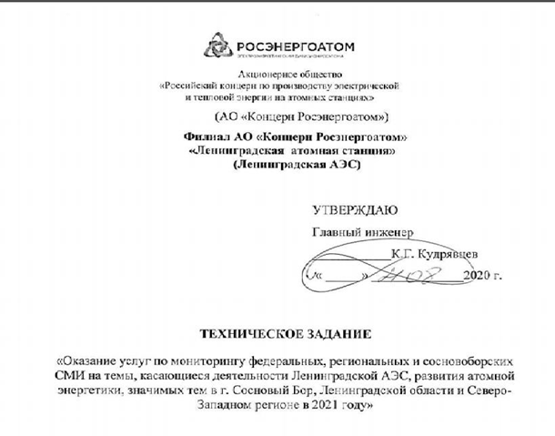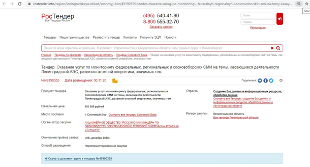 Так немного покопавшись в Интернете, а именно на сайте государственных закупок, всплыл интересный тендер. Этим Ленинградская АЭС ищет исполнителя по оказанию услуг в мониторинге федеральных, региональных и сосновоборских СМИ на темы, касающиеся деятельности Ленинградской АЭС, развития атомной энергетики, значимых тем в г. Сосновый Бор, Ленинградской области и Северо-западном регионе в 2021году.