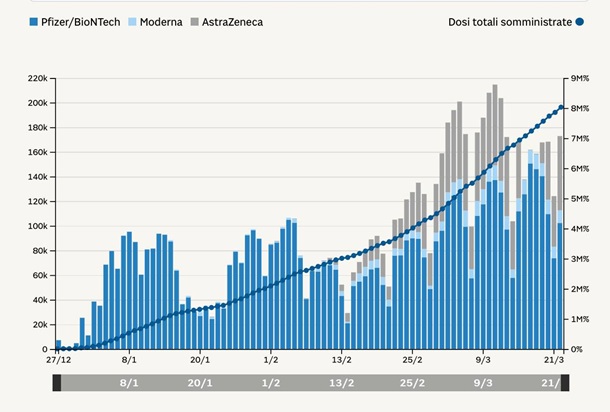 Из 2.474.000 доз вакцины AstraZeneca, находящихся сейчас в Италии, израсходовано 1.277.833, т.е. 52%. И мы еще удивляемся низким темпам вакцинации в стране (см.картинку). По-моему, было бы логично открыть онлайн-запись на Астразенеку для всех желающих. А правительство со своими "категориями", с которыми оно нянчится уже три месяца, не позволяя никому из следующей категории вакцинироваться, пока не закончат с предыдущей, пусть идет своим курсом. Уже подсчитано, что если нынешние темпы сохранятся, стадного иммунитета Италия достигнет к лету, но не этого, а 2022 года.