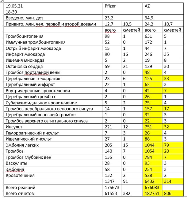 Но кроме тромбозов после введения AZ фиксируется значимо большее, чем после Pfizer количество тромбоцитопений, эмболий, кровотечений, инсультов и инфарктов, частота 1 случай на 3700 вакцинированных, летальные исходы при этом происходят с частотой 1:76 тысяч.