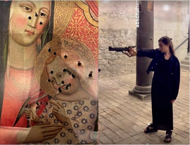нібито, стріляє в ікону Діви Марії. Інцидент викликав масове обурення серед